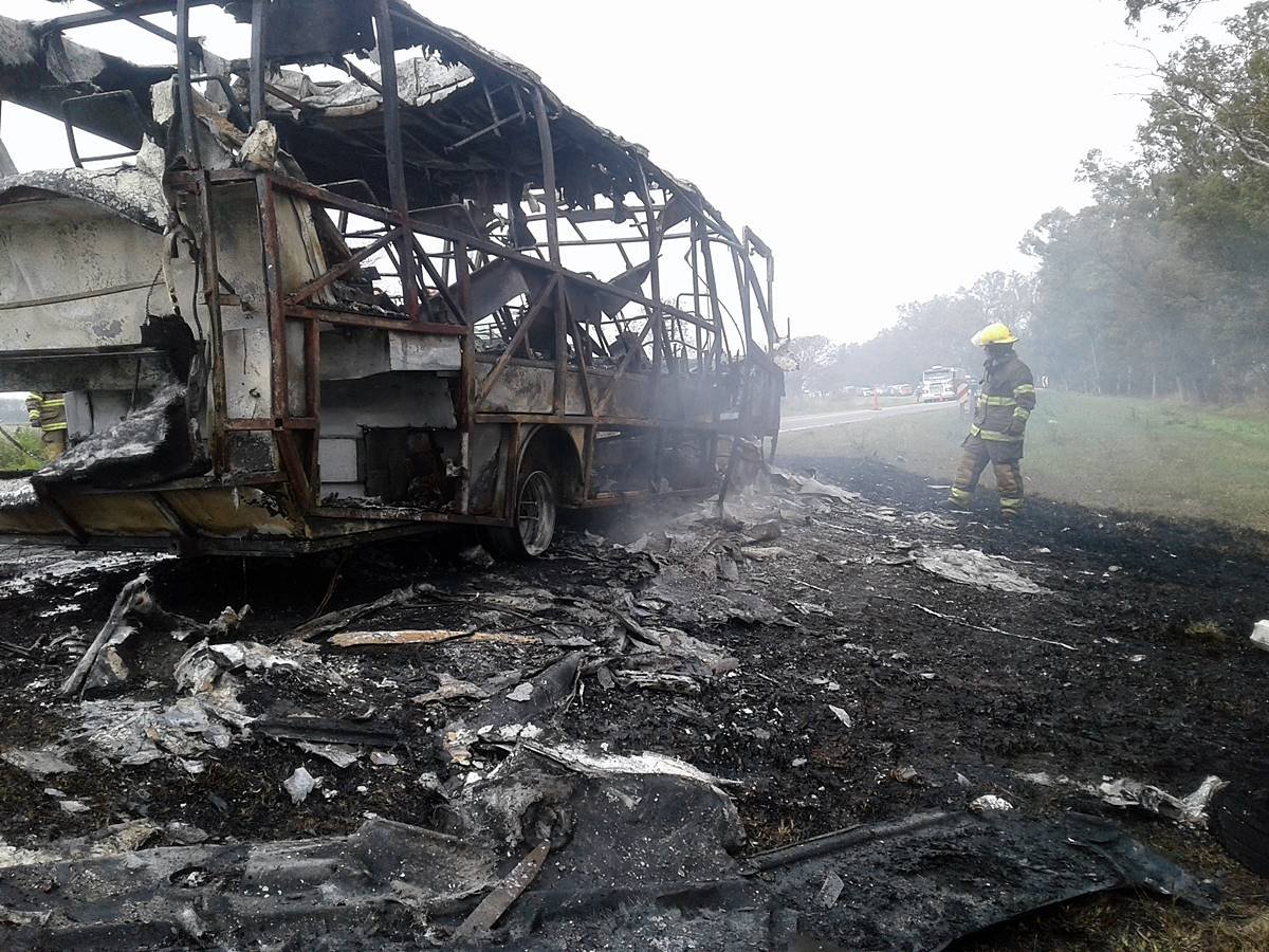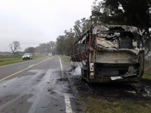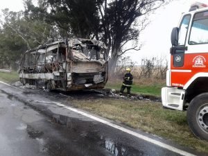 Gracias a la rapidez de acción del chofer de la unidad, los ocupantes del micro pudieron bajarse sin mayores dificultades. El minibus quedó detenido en la banquina donde fue consumido de forma total, quedando, tal como lo muestran las fotografías que acompañan esta noticia, únicamente la estructura metálica.