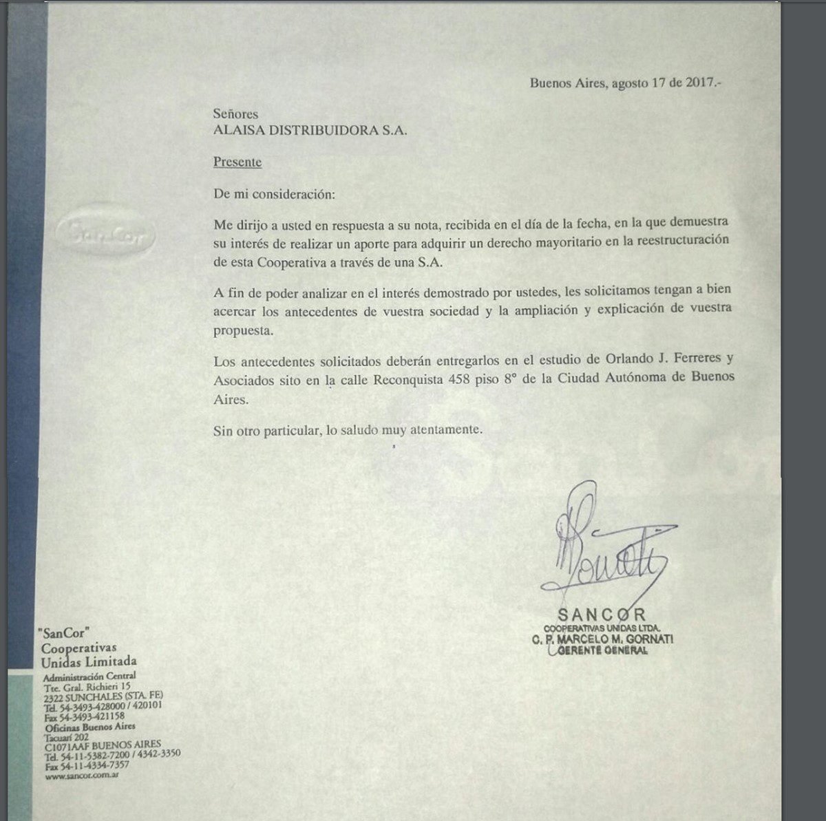 El Grupo Alaisa difundió la documentación elevada a SanCor, en la cual oficializa una oferta de 130 millones de dólares para tener el control de la Cooperativa, aportando además una línea financiera permanente de 100 millones de dólares para productores y tamberos que deseen incrementar y actualizar sus niveles de producción.
