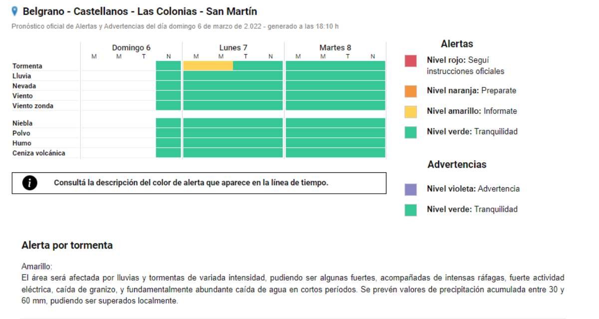 Pronóstico SAT: Alerta Amarilla para este lunes 06/03/2022 Por Redacción SH 215 Compartir FacebookTwitterWhatsAppEmail El Servicio Meteorológico Nacional emitió un nuevo Alerta Amarillo ante la posible ocurrencia de tormentas fuertes en el transcurso de la madrugada y mañana de este día lunes. El mismo, anticipa la probabilidad de tormentas de variada intensidad. TemasAlerta AmarillopronósticoSAT Compartir FacebookTwitterWhatsAppEmail Relacionadas SAT: Anticipan tormentas para la tarde de hoy 08/03/2026 SAT: Alerta Amarillo por tormentas para el martes 01/03/2026 SAT: Alerta Amarillo para esta noche 26/02/2026 Ultimas noticias Patín: Albiverdes en Torneo Zonal Categorías B y C 09/03/2026 Festram sin acuerdo y con dos jornadas de paro 09/03/2026 Robos varios del fin de semana 09/03/2026