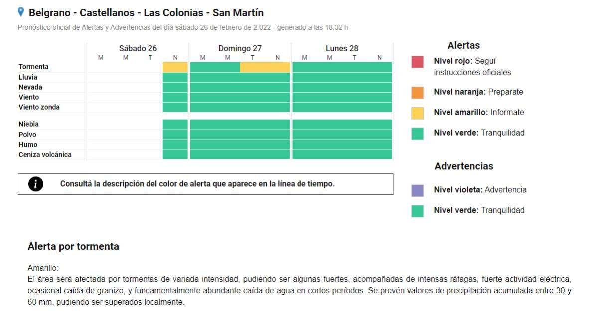 Pronóstico SAT: Alerta Amarilla para sábado y domingo 26/02/2022 Por Redacción SH 204 Compartir FacebookXWhatsAppEmail El Servicio Meteorológico Nacional emitió un Alerta Amarillo por probables tormentas fuertes para la noche de hoy. También se anticipan posibles eventos similares en el transcurso de la tarde y noche de mañana domingo. TemasAlerta AmarillapronósticoSAT Compartir FacebookXWhatsAppEmail Relacionadas SAT: Alerta por lluvias para el martes 15/03/2026 SAT: Anticipan tormentas para la tarde de hoy 08/03/2026 SAT: Alerta Amarillo por tormentas para el martes 01/03/2026 Ultimas noticias A 118 años del colegio «San José» 01/04/2026 LRF: Inferiores sin actividad 01/04/2026 Festram: Hubo acuerdo y se desactivó el paro de la semana próxima 01/04/2026