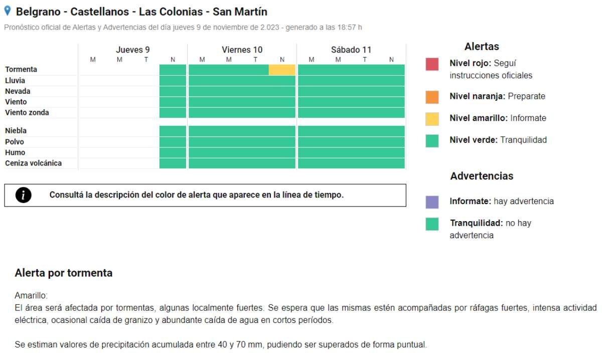 Interés general SAT: Alerta Amarilla por tormentas 09/11/2023 Por Redacción SH 229 Compartir FacebookXWhatsAppEmail El Servicio Meteorológico Nacional emitió un Alerta Amarillo para la noche de este viernes, ante la posible ocurrencia de tormentas fuertes en la región. TemasAlerta AmarillaSATSMNtormentas Compartir FacebookXWhatsAppEmail Relacionadas SAT: Alerta por lluvias para el martes 15/03/2026 SAT: Anticipan tormentas para la tarde de hoy 08/03/2026 SAT: Alerta Amarillo por tormentas para el martes 01/03/2026 Ultimas noticias LRF – F3: Libertad juega mañana al mediodía 28/03/2026 ARB F – F3: Unión frenó a San Lorenzo 28/03/2026 ARB F – F3: Ajustada derrota de Libertad 28/03/2026