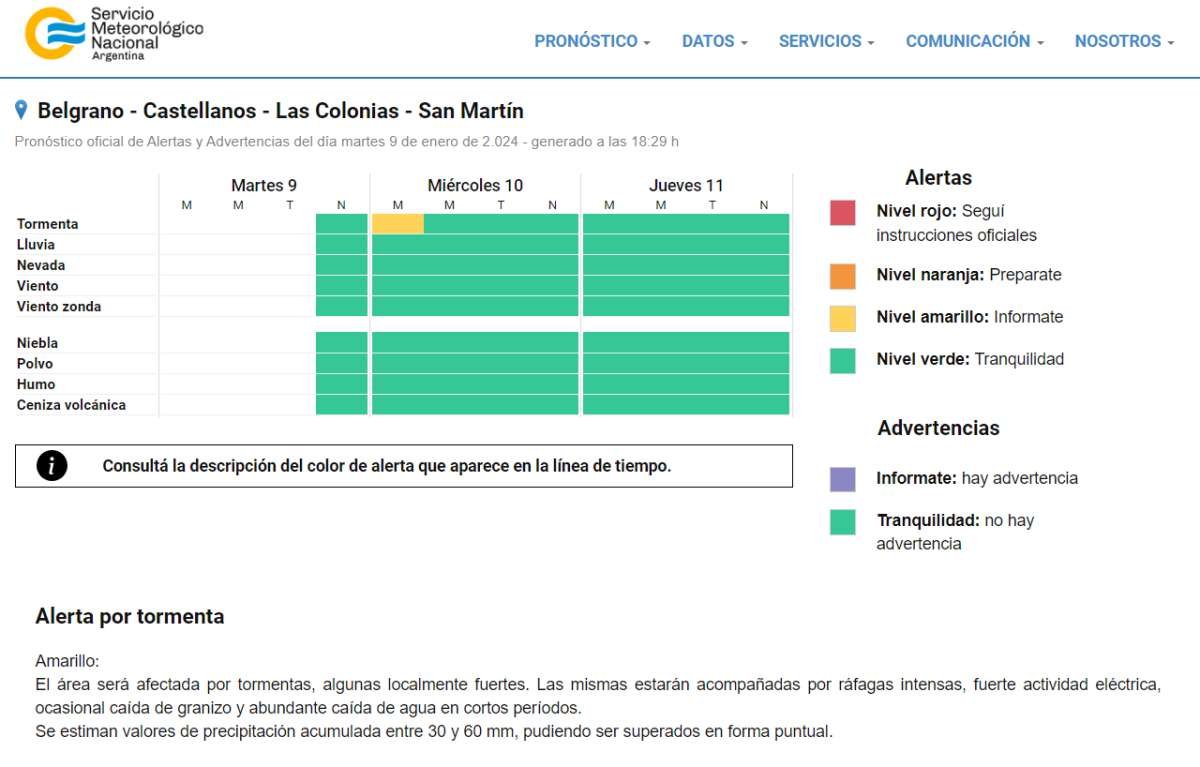 El Servicio Meteorológico Nacional emitió un nuevo Alerta Temprano Amarillo. En este caso, alcanza la madrugada de este miércoles, momento en el cual pueden producirse tormentas importantes, con abundante caída de agua. Las precipitaciones continuarían todo el día, incluso extendiéndose hasta el jueves, pero ya con menor intensidad.