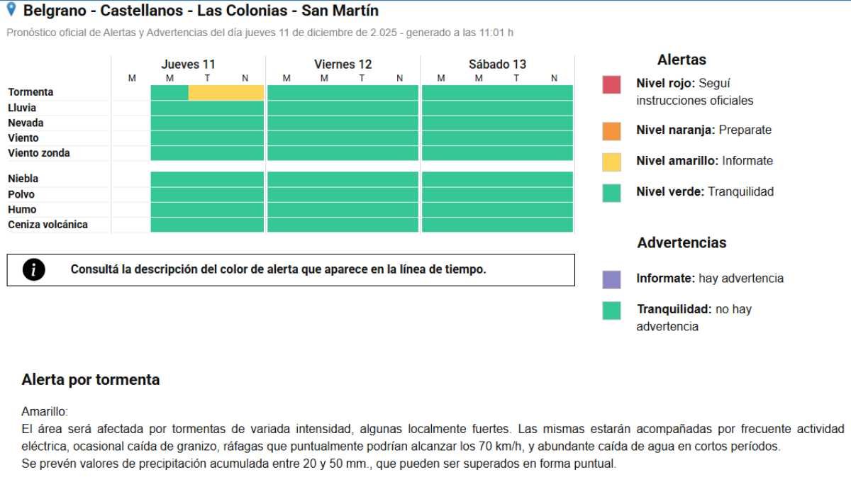 El mismo, anticipa que toda la zona será afectada por tormentas de intensidad, algunas localmente fuertes. Las mismas estarán acompañadas por actividad eléctrica, ocasional caída de granizo, ráfagas que puntualmente podrían alcanzar los 70 km/h y abundante caída de agua en cortos períodos de tiempo.