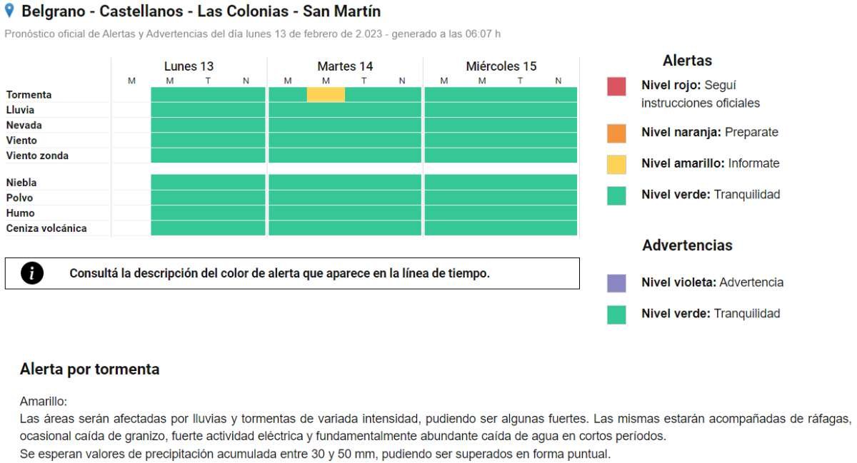 Interés general SAT: Alerta Amarillo para mañana martes 13/02/2023 Por Redacción SH 108 Compartir FacebookXWhatsAppEmail El Servicio Meteorológico Nacional emitió un Alerta Amarillo, anticipando la posible ocurrencia de tormentas fuertes que podrían tener desarrollo en nuestra región en la mañana de este martes. TemasAlerta AmarillopronósticoSATSMN Compartir FacebookXWhatsAppEmail Relacionadas SAT: Alerta por lluvias para el martes 15/03/2026 SAT: Anticipan tormentas para la tarde de hoy 08/03/2026 SAT: Alerta Amarillo por tormentas para el martes 01/03/2026 Ultimas noticias Jornada por la Democracia 19/03/2026 ARB F – F1: Las chicas de Unión arrancaron con un traspié 19/03/2026 A 70 años de Alpid 19/03/2026