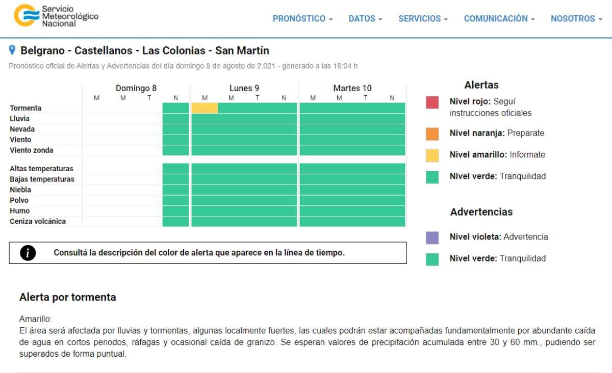El Servicio Meteorológico Nacional emitió un Alerta Temprano Amarillo, ante la posible ocurrencia de tormentas fuertes en el transcurso de las primeras horas de este lunes, afectando a toda la zona con posibles precipitaciones que pueden acumular entre 30 y 60 milímetros.