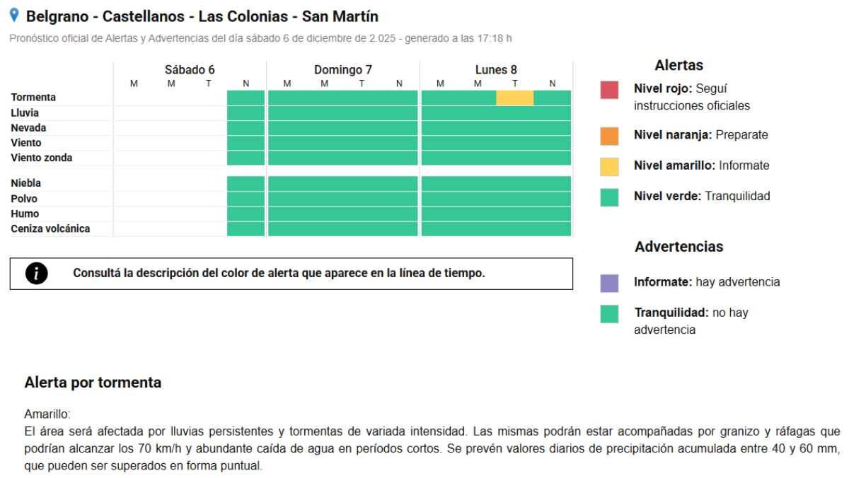 Interés general SAT: Alerta Amarillo por tormentas para el lunes 06/12/2025 Por Redacción SH 61 Compartir FacebookXWhatsAppEmail El Servicio Meteorológico Nacional emitió un Alerta Amarillo por posibles tormentas que pueden llegar a registrarse en el transcurso de todo el día domingo y lunes, con especial intensidad en la tarde de esta última jornada. TemasAlerta AmarillapronósticoSATSMNtormentas Compartir FacebookXWhatsAppEmail Relacionadas SAT: Alerta por lluvias para el martes 15/03/2026 SAT: Anticipan tormentas para la tarde de hoy 08/03/2026 SAT: Alerta Amarillo por tormentas para el martes 01/03/2026 Ultimas noticias LRF – F3: Libertad juega mañana al mediodía 28/03/2026 ARB F – F3: Unión frenó a San Lorenzo 28/03/2026 ARB F – F3: Ajustada derrota de Libertad 28/03/2026