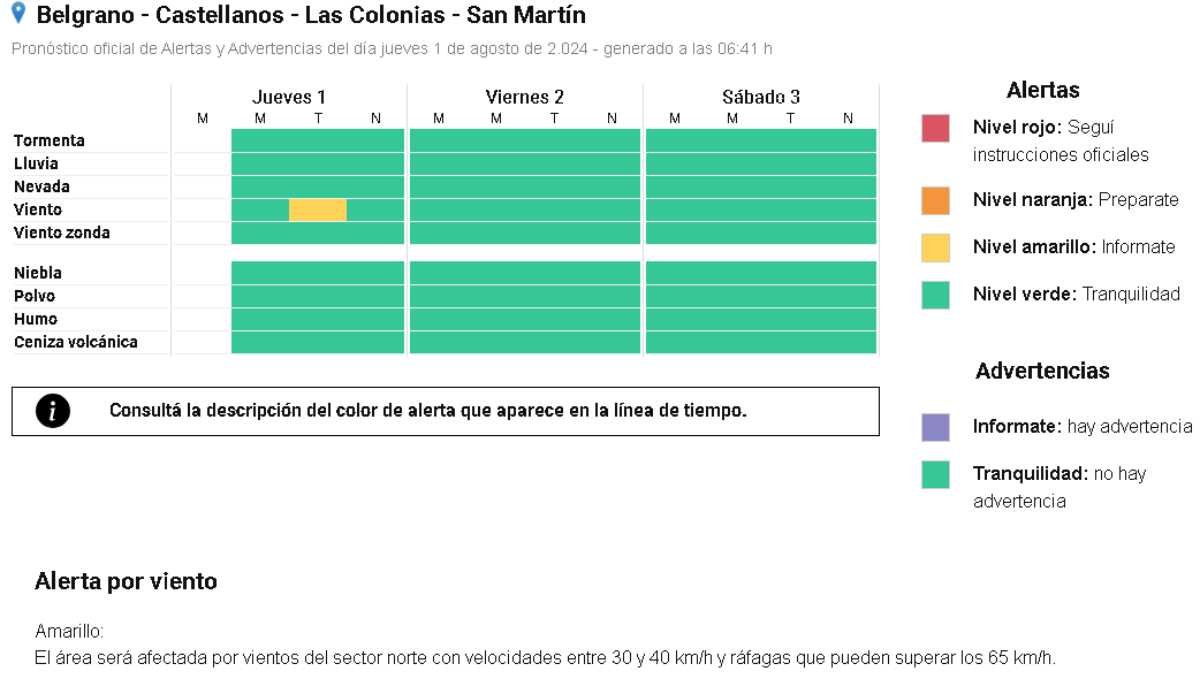 Interés general SAT: Alerta Amarillo por vientos fuertes 01/08/2024 Por Redacción SH 66 Compartir FacebookTwitterWhatsAppEmail El Servicio Meteorológico Nacional emitió un Alerta Amarillo ante la posible ocurrencia de vientos que pueden llegar a superar los 65 kilómetros por hora en la tarde de hoy. También mañana estará ventoso durante todo el día. TemasAlerta AmarillapronósticoSATvientos Compartir FacebookTwitterWhatsAppEmail Relacionadas SAT: Inestabilidad y Alerta por tormentas 05/02/2026 SAT: Alerta Amarillo por tormenta 31/01/2026 SAT: Inestabilidad y tormentas para este miércoles 28/01/2026 Ultimas noticias LMB: Libertad debuta ante el 9 de Morteros 11/02/2026 Copa Departamento: Mañana se juega la revancha del clásico local 11/02/2026 Eempa: Inscripciones abiertas 10/02/2026