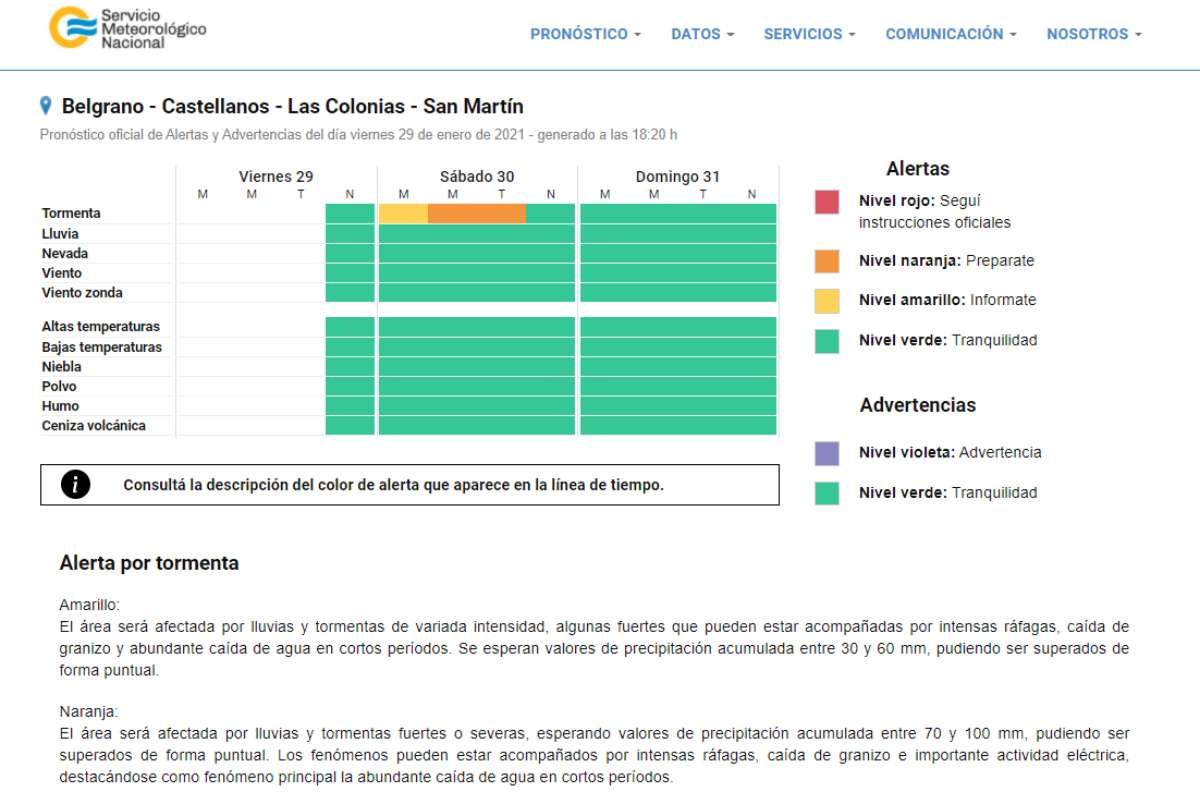 El Servicio Meteorológico Nacional emitió un Alerta Temprana de color amarillo para esta madrugada de sábado y naranja para la mañana y tarde. Anticipa posibles tormentas fuertes, con ráfagas y precipitaciones abundantes.