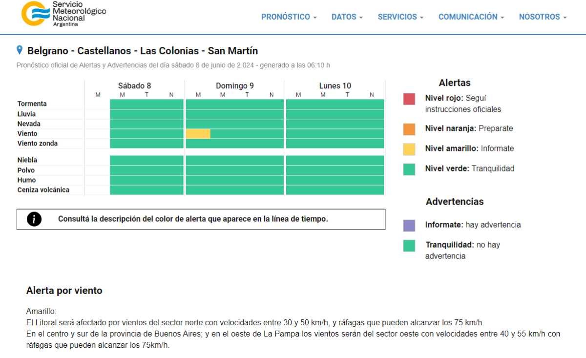 Interés general SAT: Alerta por vientos para mañana domingo 08/06/2024 Por Redacción SH 265 Compartir FacebookTwitterWhatsAppEmail El Servicio Meteorológico Nacional emitió un Alerta Amarillo a través de su Sistema de Alerta Temprana. Se trata del anticipo de la posible ocurrencia de vientos de entre 30 y 50 kilómetros por hora, pudiendo incluso alcanzar los 75 km/h. TemasAlerta AmarillopronósticoSATSMNvientos Compartir FacebookTwitterWhatsAppEmail Relacionadas SAT: Alerta Naranja para esta noche 18/02/2026 SAT: Anticipan lluvias importantes 14/02/2026 SAT: Inestabilidad y Alerta por tormentas 05/02/2026 Ultimas noticias Medidas alternativas para tres sunchalenses que se resistieron al accionar policial en el Carnaval 18/02/2026 Carnavales 2026: Una propuesta que se sostiene a futuro con entrega y colorido 18/02/2026 SAT: Alerta Naranja para esta noche 18/02/2026