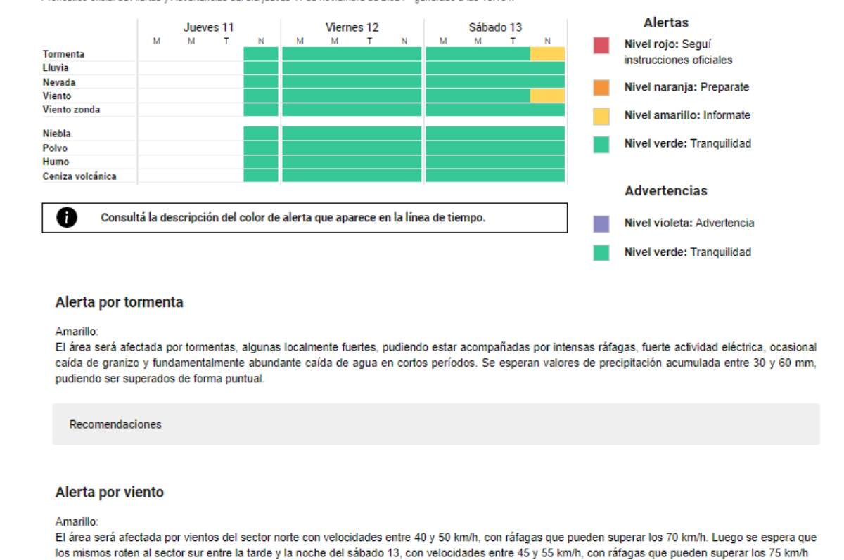 El Servicio Meteorológico Nacional emitió un Alerta Amarillo para la noche de este sábado, anticipando la posible ocurrencia de tormentas fuertes, con ráfagas de viento de entre 40 y 50 kilómetros por hora, llegando incluso a los 70 kilómetros por hora.