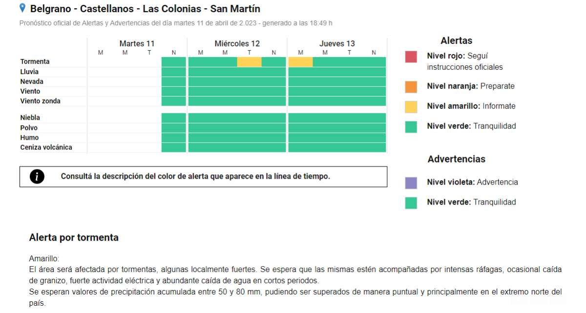 Interés general SAT: Emiten Alerta Amarillo por tormentas para miércoles y jueves 11/04/2023 Por Redacción SH 60 Compartir FacebookXWhatsAppEmail El Servicio Meteorológico Nacional emitió un Alerta Amarillo, anticipando la posible ocurrencia de tormentas fuertes que pueden darse en la tarde de este miércoles y por la mañana del jueves. TemasAlerta AmarillopronósticoSAT Compartir FacebookXWhatsAppEmail Relacionadas SAT: Alerta por lluvias para el martes 15/03/2026 SAT: Anticipan tormentas para la tarde de hoy 08/03/2026 SAT: Alerta Amarillo por tormentas para el martes 01/03/2026 Ultimas noticias Jornada por la Democracia 19/03/2026 ARB F – F1: Las chicas de Unión arrancaron con un traspié 19/03/2026 A 70 años de Alpid 19/03/2026