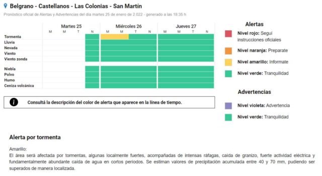 El Servicio Meteorológico Nacional extendió el Alerta Amarillo ante la posible ocurrencia de tormentas fuertes y abundante caída de precipitaciones en la madrugada y mañana de este miércoles. Durante hoy martes, el acumulado de precipitaciones se ubicó en 80.5 milímetros.