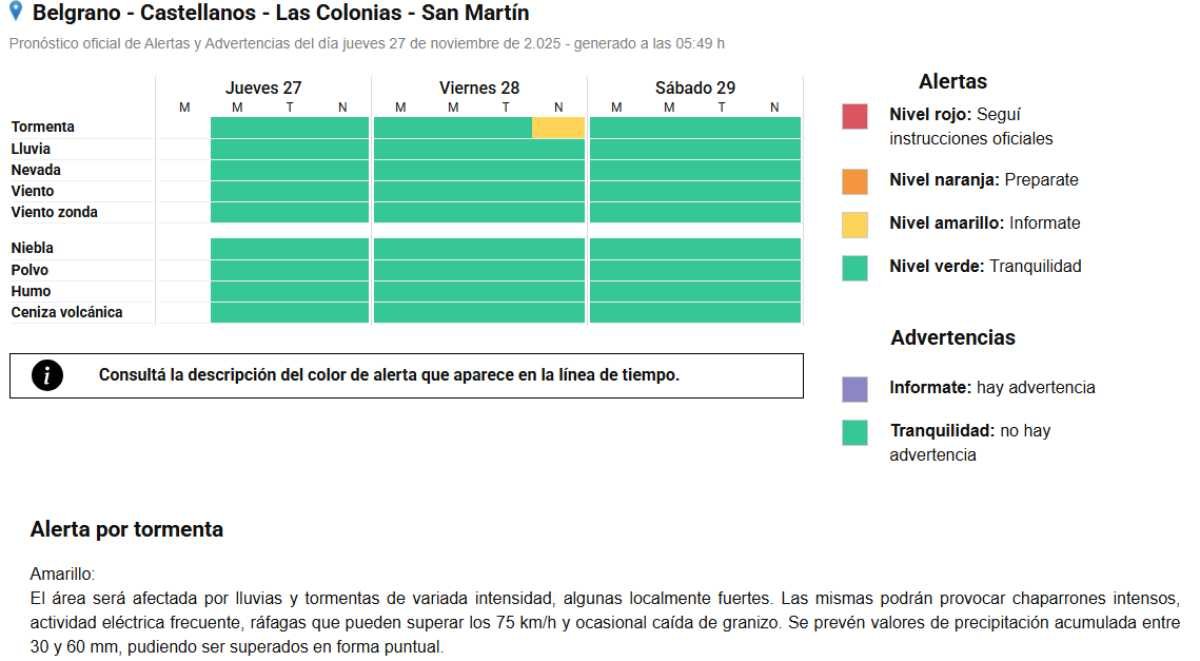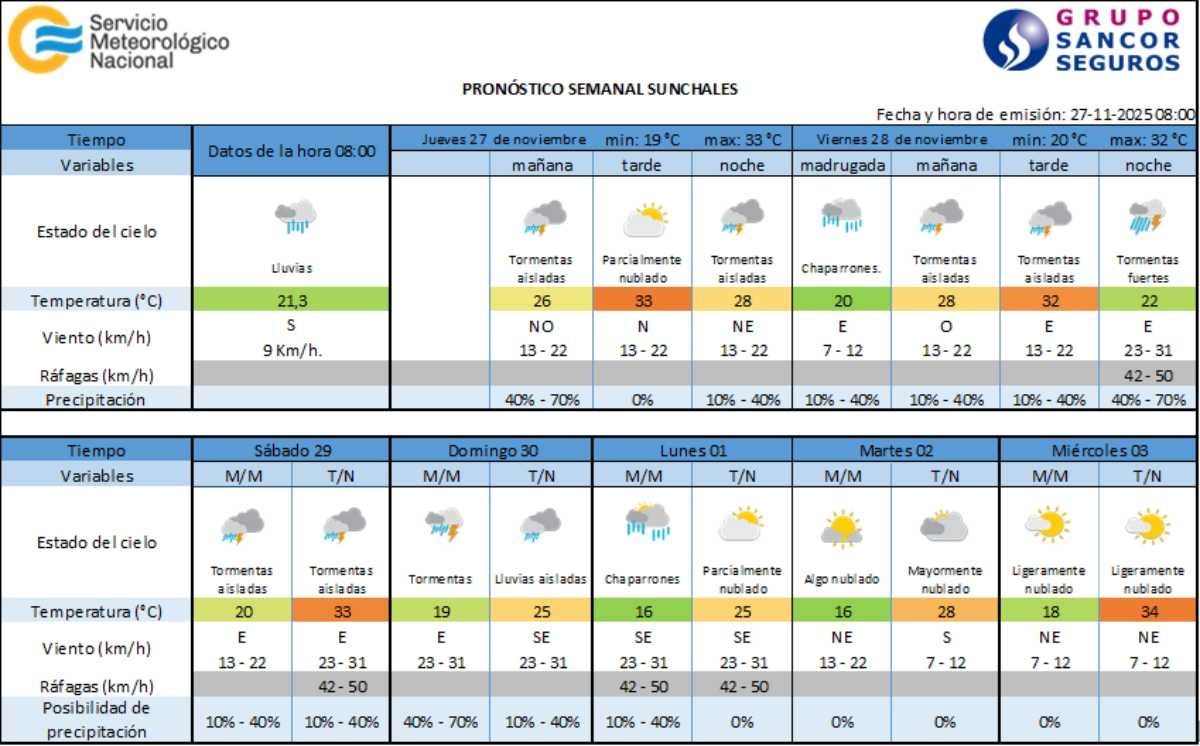 El Servicio Meteorológico Nacional emitió un Alerta Amarillo ante la posible ocurrencia de tormentas fuertes que pueden llegar a generarse en el transcurso de las próximas horas con inestabilidad y lluvias. Además, el viernes a la noche, se generarían tormentas fuertes en nuestra región.