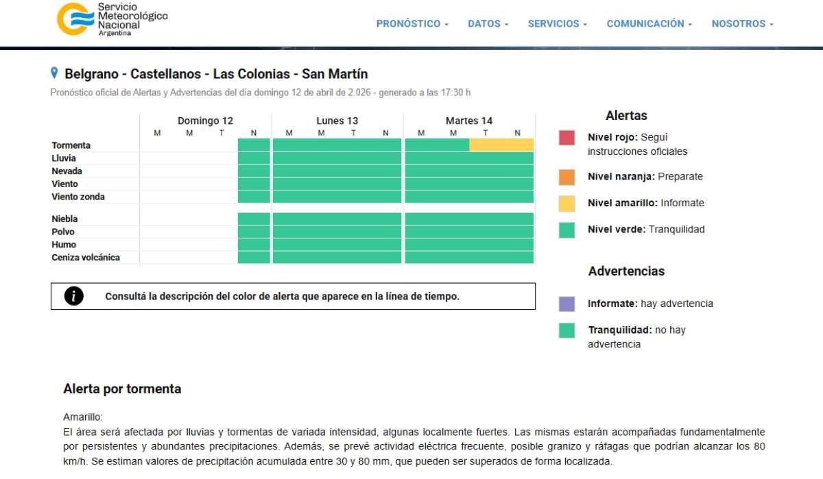 El Servicio Meteorológico Nacional emitió un Alerta Temprano para el próximo martes, anticipando la posible ocurrencia de tormentas fuertes que podrían llegar a producirse en el transcurso de la tarde y noche de dicha jornada.