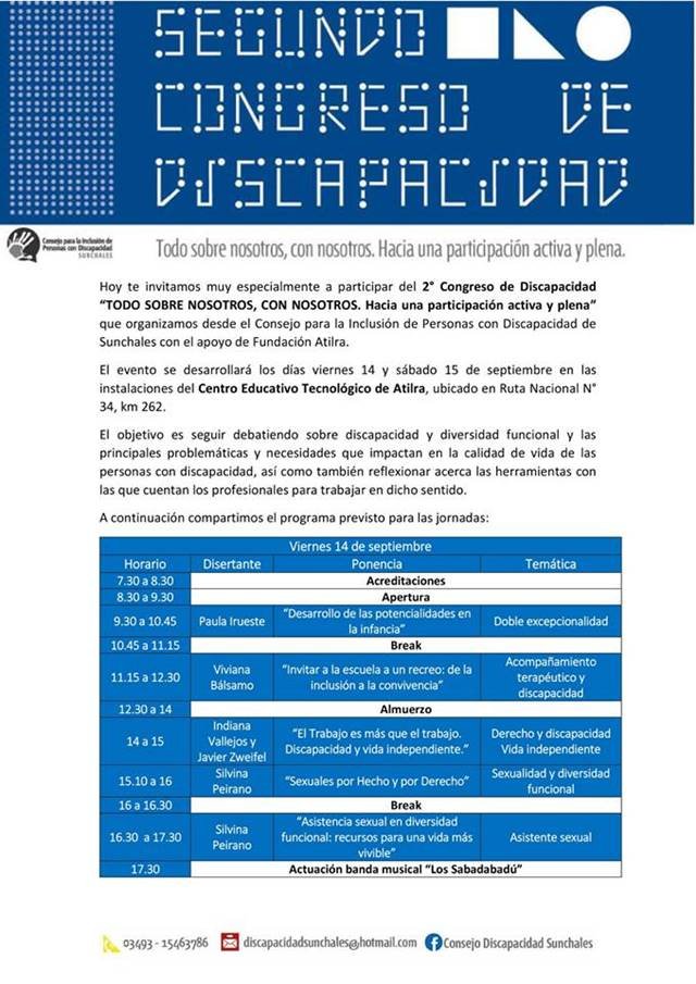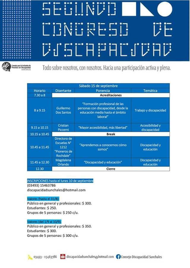 Organizado por el Consejo para la Inclusión de Personas con Discapacidad de Sunchales, el próximo 14 y 15 de septiembre en el CET Atilra, se realizará el Segundo Congreso.
