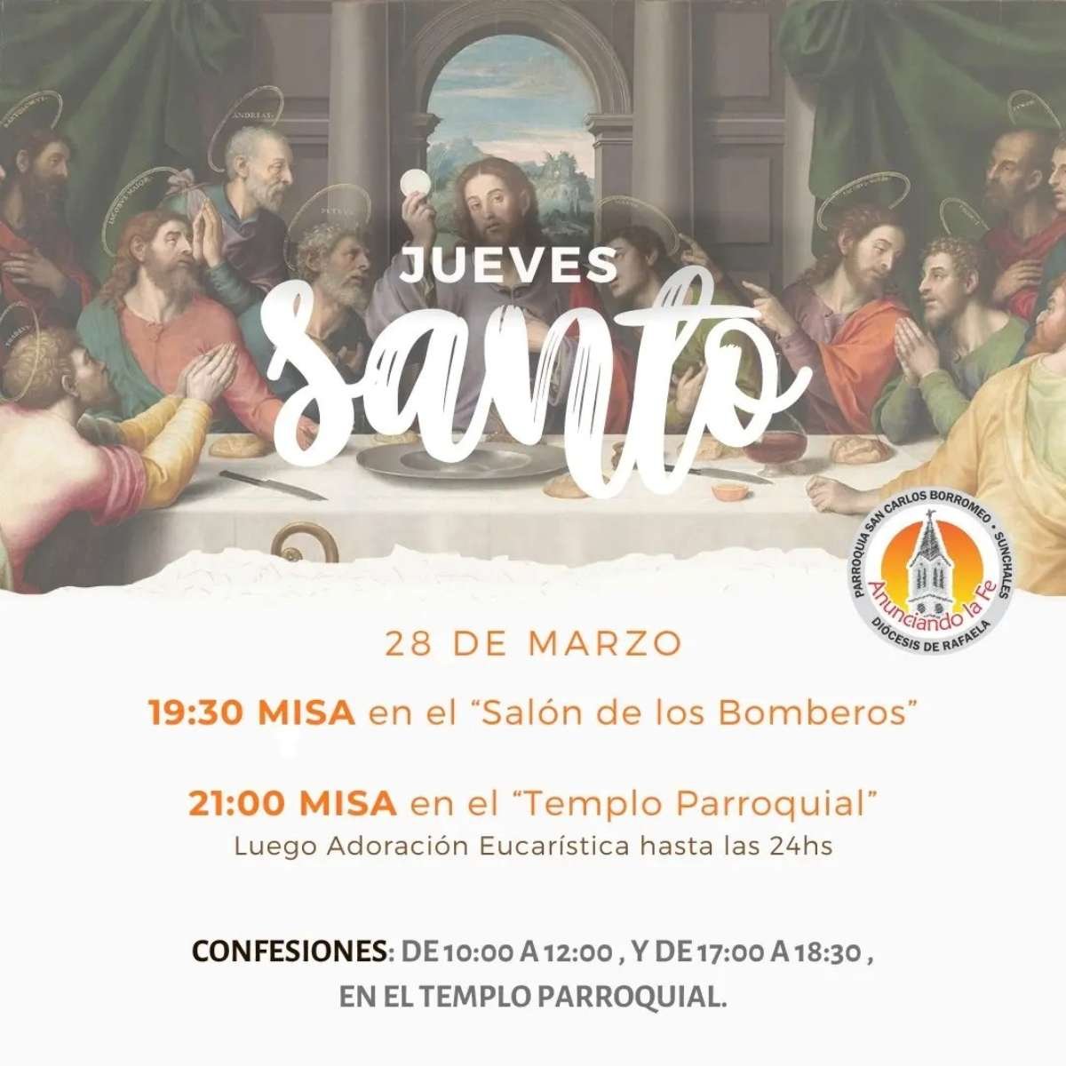 Sociedad Semana Santa, actividades parroquiales 29/03/2024 Por Redacción SH 20 Compartir FacebookXWhatsAppEmail Desde la Secretaría Parroquial remitieron las actividades que estarán organizándose en el transcurso de las próximas jornadas, para celebrar una nueva Semana Santa. 1 de 4 Temasparroquia San CarlosSemana Santa Compartir FacebookXWhatsAppEmail Relacionadas Actividades parroquiales 13/03/2026 Actividades parroquiales 06/03/2026 Misas de Navidad en parroquia «San Carlos» 24/12/2025 Ultimas noticias ARB F – F3: Juegan Unión y Libertad 27/03/2026 A 48 años del Ispi N° 4003 «San José» 27/03/2026 A 4 años de la puesta en marcha del Espacio de Diálogo Interreligioso 27/03/2026