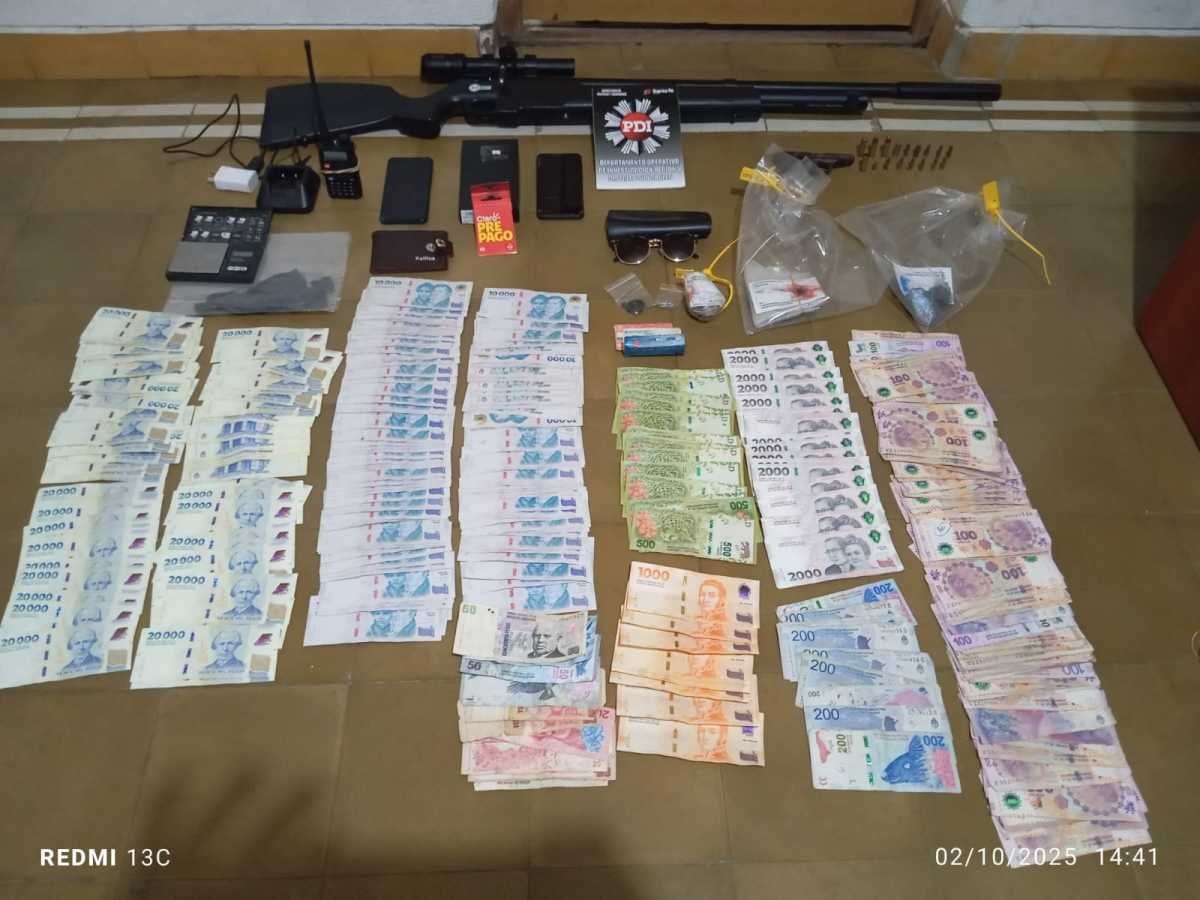 Como resultado del procedimiento, los agentes secuestraron un trozo compacto de cocaína (35,7 g), picadura de marihuana (67 g), varios recortes de nylon para fraccionamiento, una balanza digital sin marca visible, dos teléfonos celulares, un equipo de handy banda ancha, un rifle de aire comprimido calibre 5,5 con mira telescópica, un arma de fuego calibre .22 corto, vainas servidas y sin accionar de varios calibres y $2.744.740 en efectivo.