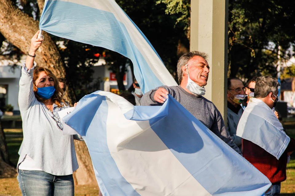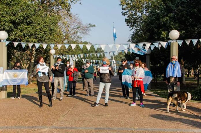 La convocatoria efectuada mediante redes sociales en el transcurso de la semana reunió a decenas de vecinos en plaza Libertad, a fin de manifestarse con banderas nacionales, expresando así su descontento con la decisión de intervenir la empresa Vicentín.