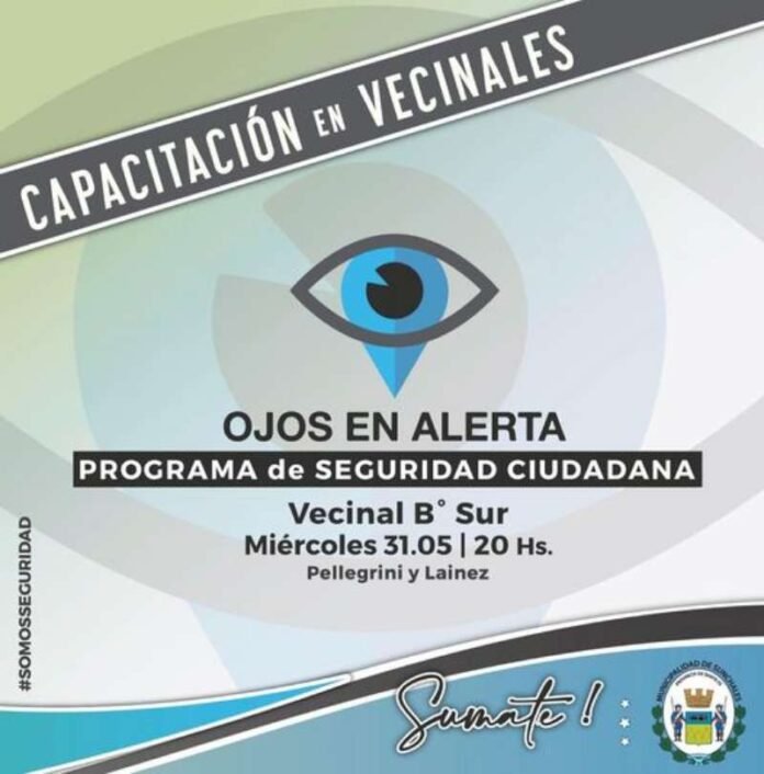 El Municipio informó que continuando con las recorridas por instituciones y entidades de la ciudad, el venidero miércoles 31 del corriente mes a la hora 20, se realizará una nueva capacitación del programa «Ojos en Alerta». En este caso, el espacio elegido será la sede vecinal del Barrio Sur.