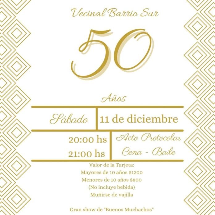 La Comisión Vecinal del barrio Sur, que ha recientemente celebrado los 50 años de su creación, informa que ya se encuentran a la venta las tarjetas para la cena con la cual evocarán esta fecha. Además, habrá un acto protocolar y también otras actividades sorpresa organizadas a tal fin.