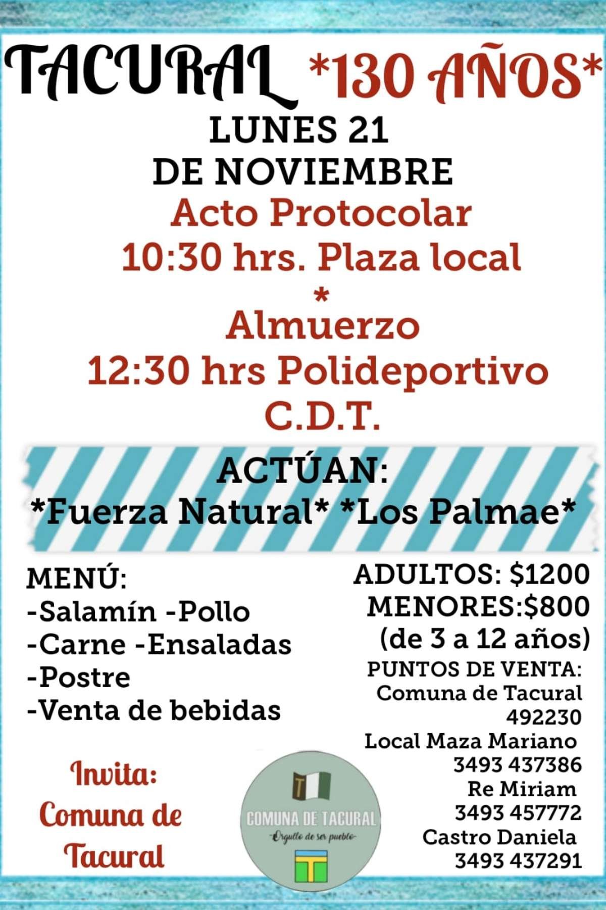 Tal como venía siendo anticipado, con los actos oficiales, el próximo lunes 21, la Comuna de Tacural realizará la celebrará de sus 130 años de vida.