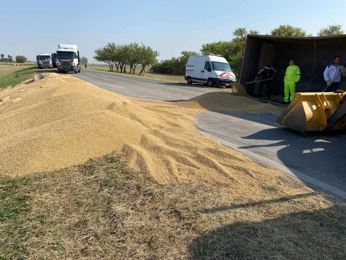 Por motivos que se intentaban establecer, en la mañana de hoy, un camión Iveco que transitaba por Ruta Nacional Nº 34 a la altura de Tacural, sufrió el vuelco de su acoplado, dejando toda su carga de cereal sobre la calzada.