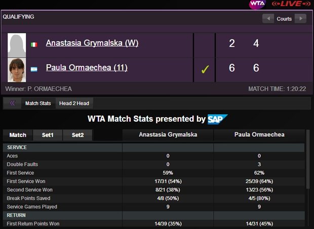 Pasado el mediodía de hoy se produjo el triunfo de la sunchalense Paula Ormaechea 6-2 y 6-4 ante la invitada local Anastasia Grymalska en la primera ronda de la qualy del WTA Premier de Roma.