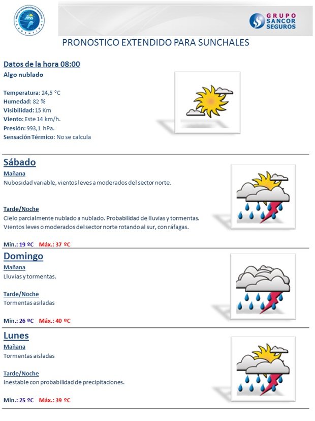 De acuerdo al parte difundido por el organismo, en esa área del país se esperan lluvias y tormentas, «pudiendo ser algunas de éstas localmente fuertes, con abundante caída de agua en poco tiempo, probable caída de granizo, ráfagas y actividad eléctrica».