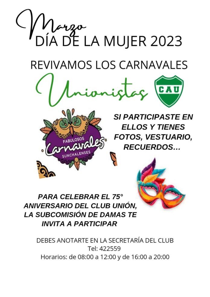 Retomando una actividad que se había suspendido por la pandemia, la subcomisión de Damas del club Atlético Unión convoca a aquellas mujeres que tuvieron participación en los carnavales de antaño, a que se sumen activamente en lo que será la celebración por el Día de la Mujer.