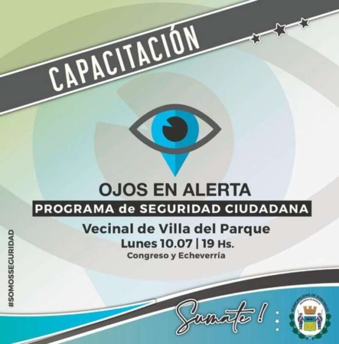El Municipio informó que continuando con las recorridas por instituciones y entidades de la ciudad, este lunes a la hora 19, se realizará una nueva capacitación del programa «Ojos en Alerta». En este caso, el espacio elegido será nuevamente la sede vecinal del Barrio Villa del Parque (Echeverría y Congreso), tal como había sucedido hace unas semanas.